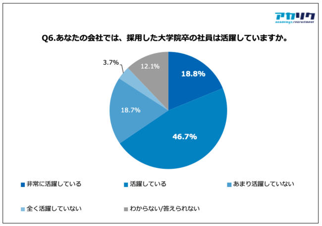 「Q6.あなたの会社では、採用した大学院卒の社員は活躍していますか。」(n=107)と質問したところ、「非常に活躍している」が18.8%、「活躍している」が46.7%という回答となりました。