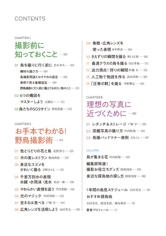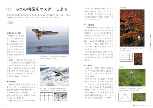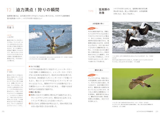 「お手本にしたい野鳥写真」をテーマにした、野鳥撮影のコツやテクニックを解説する指南書です。花と鳥を絡めるならどんな時期がよいのか、流れる水を撮るにはどのような設定が必要なのか、身近なスズメを撮るコツは?といった、比較的取り入れやすい作風やテクニックから、飛翔や狩りの瞬間、スピーディーで難しい瞬間まで、幅広く網羅しています。