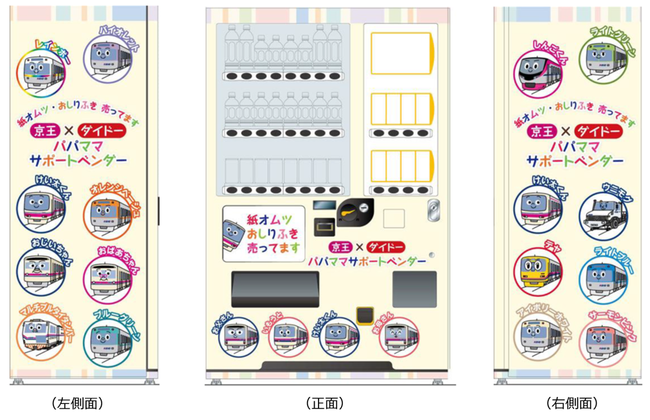 また、本自販機は、京王電鉄キャラクター「けい太くんと仲間たち」のイラストを施すことで、お子さまにも親しんでいただきやすいデザインとしており、飲料や紙おむつを購入する以外の楽しみも提供いたします。