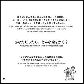 本ワークブックは、子どもたちが「見て」「調べて」「考える」を重ねて自由な発想ができるよう、かきこめるページなどのさまざまな仕掛けやワーク[1] [2] 、初公開となる広島のエピソードを会話形式で収録するなど工夫を凝らした制作となりました。また、本ワークブックはヘリングの理念に沿って多くのこどもたちに分け隔てなくその理念が伝わるよう、ほとんどを子どもたちへ無料配布します。