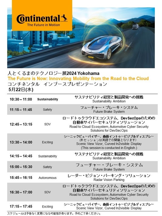 プレゼンテーションスケジュールは、特設サイト(https://www.continental.com/ja-jp/press/press-release/aee-2024/) または、以下をご覧ください。