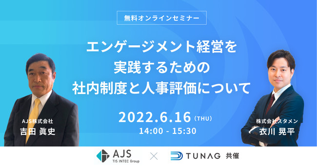 エンゲージメント経営プラットフォーム「TUNAG(ツナグ)」を提供する株式会社スタメン(本社:愛知県名古屋市 代表取締役社長:加藤 厚史)は、AJS株式会社(本社:東京都新宿区 代表取締役社長:山本 修司)と共催で、2022年6月16日(木)にオンラインセミナーを開催いたします。