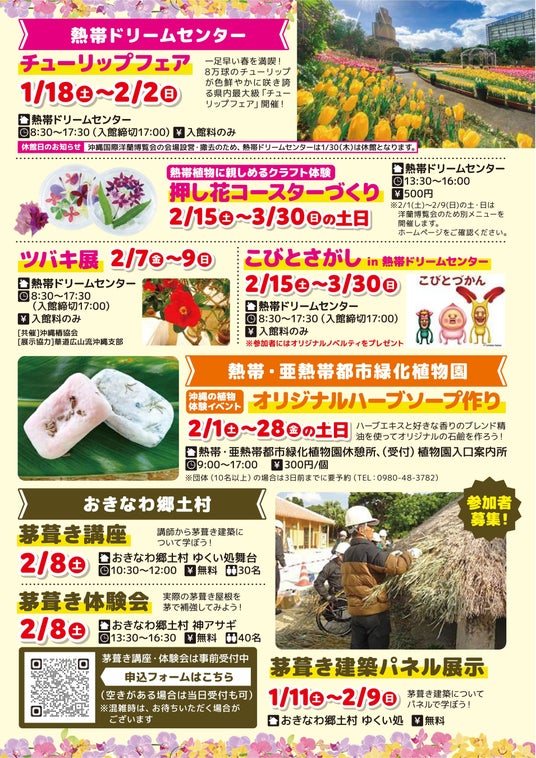 沖縄県内最大級の花のイベント沖縄国際洋蘭博覧会、民族音楽や沖縄民謡を楽しめるステージイベント、おきなわ郷土村での茅葺き体験会など海洋博公園での様々なイベント情報を掲載しております。詳細は海洋博公園公式HPにてご確認ください。