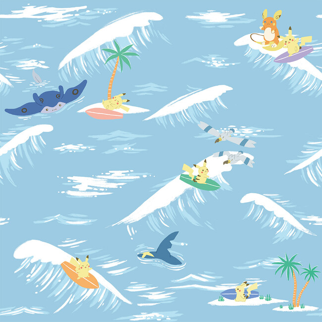 色とりどりのサーフボードで元気に遊ぶピカチュウは、他のポケモンたちと一緒にいて楽しそうな様子だ。
