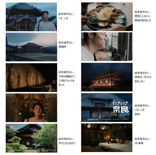 『いざ、いざ 興福寺』というセリフから始まる本CMは、鈴木亮平さんが奈良市中心部に位置する世界遺産・興福寺と奈良町エリアを旅するストーリーです。興福寺では阿修羅像をはじめとする数多くの貴重な文化財や、現代に蘇った中金堂に出合い、”タイムスリップ感“を味わう鈴木亮平さんの様子が描かれています。その圧倒的スケール感と色彩に魅了される表情に注目です。興福寺を拝観した後、奈良の町へ出る鈴木亮平さん。書院でお庭を眺めながらスイーツを堪能する姿や、日本では奈良にルーツがある”スパイス”が特徴的なカレーを食べながら、その美味しさに思わず笑顔をこぼす自然体な姿も。また夜の興福寺や奈良町エリアでは、現代だから楽しめるライトアップされたお寺の幻想的な景色や、町の大人な静けさに浸れる魅力が描かれています。