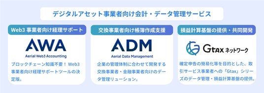 - ADM(Aerial Data Management):https://www.aerial-p.com/service暗号資産交換業者や第一種金融商品取引業者等「金融事業者向け」のデータ管理・帳簿作成支援ソリューション。各企業の管理体制に合わせたシステムの開発・提供。