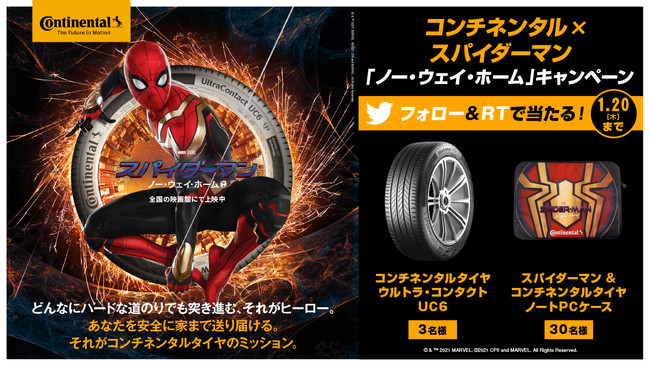 コンチネンタルタイヤ・ジャパン株式会社(所在地:東京都品川区/代表取締役社長:ニコラオス・キリアゾプロス)は、2022年1月7日 (金) より1月20日 (木) まで、映画『スパイダーマン:ノー・ウェイ・ホーム』とのタイアップキャンペーンを実施いたします。