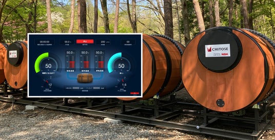 ユニークな樽型デザインの堆肥化プラント。残渣や家畜排泄物が微生物の力で有機肥料になる過程をリアルタイムに可視化するモニターも備わり、誰もが生物変換を身近に学ぶことができる。