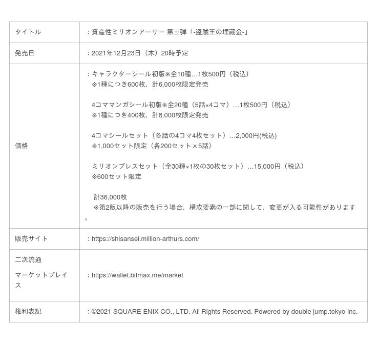 株式会社スクウェア・エニックス(本社:東京都新宿区、代表取締役社長:松田洋祐)は、2021年12月23日(木)20時から、NFTデジタルシール『資産性(しさんせい)ミリオンアーサー』第三弾「-盗賊王の埋蔵金-」を、数量限定で1枚500円(税込)で発売します。