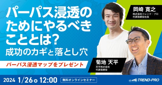 株式会社トレンド・プロ(本社:東京都港区、代表取締役社長:岡崎寛之、以下トレンド・プロ)は、天平株式会社(本社:神奈川県横浜市、代表取締役:菊地天平、以下TENPEI)と共同で、パーパス浸透のためにやるべきことや、成功のカギ、注意点をお伝えするオンラインセミナーを1/26(金)12時から開催いたします。
