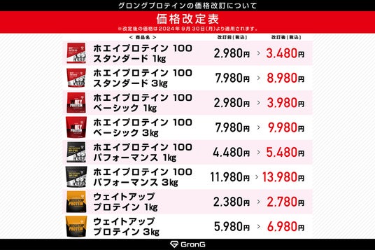 つきましては、ホエイプロテイン商品の価格を以下の通り改定させていただきます。改定後の価格は2024年9月30日(月)より適用されます。お客様には多大なるご迷惑をおかけしますが、何卒ご理解賜りますようよろしくお願い申し上げます。