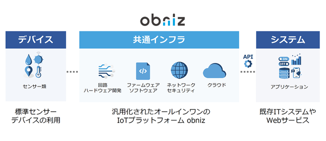 obnizは、IoTに必要な機能や要素を含んだ共通のIoTインフラを提供しています。この共通インフラを使用することで、標準センサーとITシステム、Webサービスを簡単につなぎ、IoTシステムやサービスを短期間かつ低価格で立ち上げることができます。