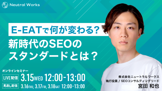 株式会社ニュートラルワークス(神奈川県茅ヶ崎市 代表取締役:三木五月、以下 ニュートラルワークス)は、オンライン無料ウェビナー「 E-EATで何が変わる?新時代のSEOのスタンダードとは?」を3月15日(水) 12時より実施いたします。