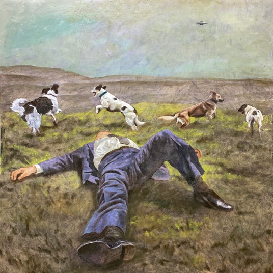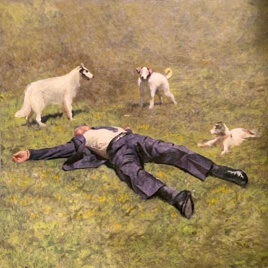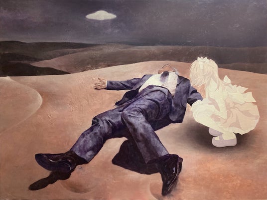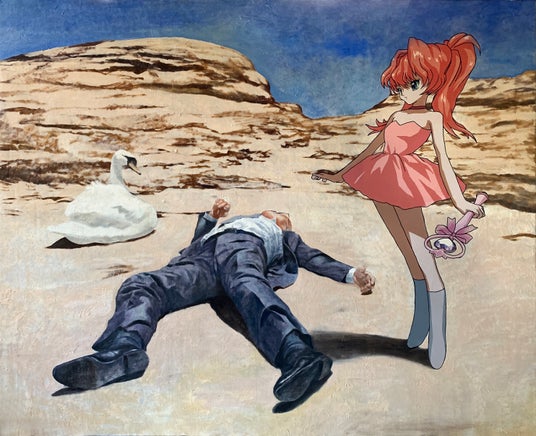 西洋絵画の写実的な技法と日本の絵画に見られる超平面的な表現を融合させ、現代社会の混沌の中で「欠落」を感じながら生きる人々を象徴するモチーフを描いています。背広姿のAKIO*¹や二次元で描かれる魔法少女といったキャラクターが混在するミスマッチが、独特な魅力と不安感を与えています。