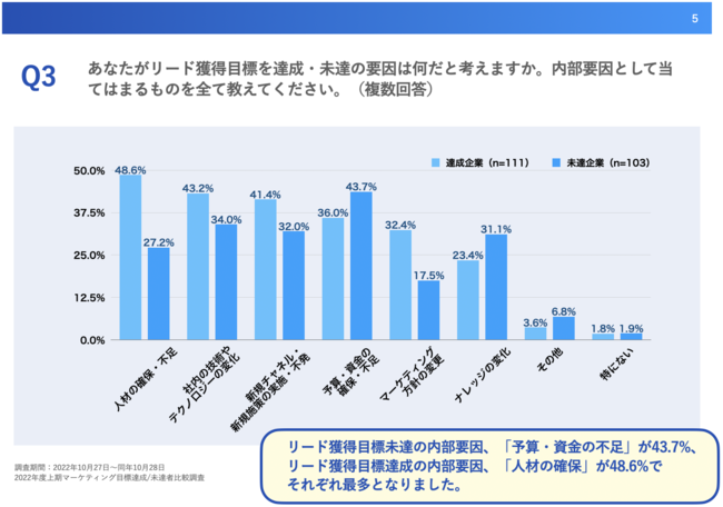 「Q3.あなたがリード獲得目標を達成・未達の要因は何だと考えますか。内部要因として当てはまるものを全て教えてください。(複数回答)」と質問したところ、達成企業(n=111)は「人材の確保」が48.6%、「社内の技術やテクノロジーの変化」が43.2%、「新規チャネル・新規施策の実施」が41.4%、未達企業(n=103)は「予算・資金の不足」が43.7%、「社内の技術やテクノロジーの変化」が34.0%、「新規チャネル・新規施策の不発」が32.0%という回答となりました。