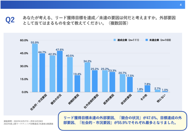 「Q2.あなたが考える、リード獲得目標を達成/未達の要因は何だと考えますか。外部要因として当てはまるものを全て教えてください。(複数回答)」と質問したところ、達成企業(n=111)は「社会的・市況要因」が55.9%、「競合の状況」が42.3%、「時期的要因」が40.5%、未達企業(n=103)は「競合の状況」が47.6%、「社会的・市況要因」が44.7%、「社外技術的要因」が25.2%という回答となりました。
