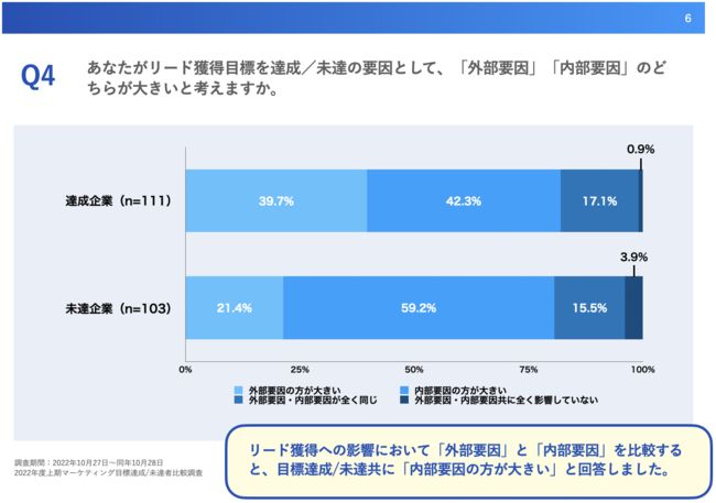 「Q4.あなたがリード獲得目標を達成/未達の要因として、「外部要因」「内部要因」のどちらが大きいと考えますか。」と質問したところ、達成企業(n=111)は「外部要因の方が大きい」が39.7%、「内部要因の方が大きい」が42.3%、未達企業(n=103)は「外部要因の方が大きい」が21.4%、「内部要因の方が大きい」が59.2%という回答となりました。