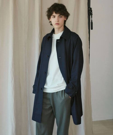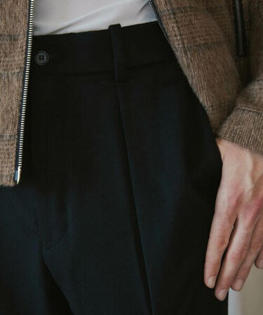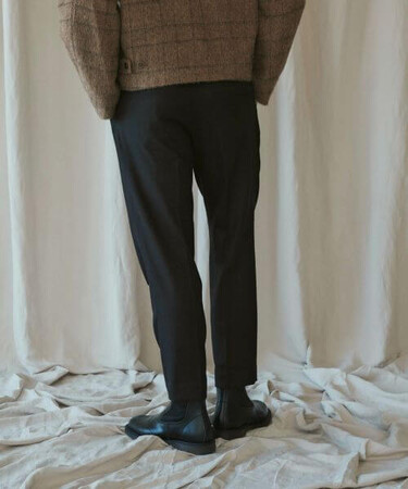 トップスやシューズを選ばない万能なスラックスで、大きなトップスをしっかりと受け止めるように、腰回りはややゆとりを持たせ、更にタックを入れることで立体感のあるモダンなシルエット。
