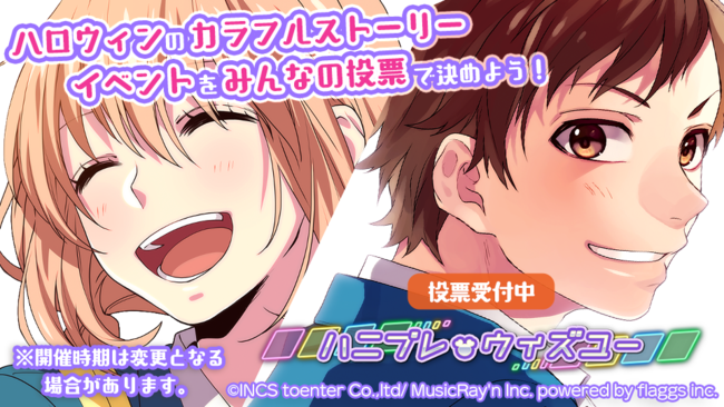 株式会社flaggs(本社:東京都品川区、代表取締役CEO:吉江直人)と株式会社インクストゥエンター(本社:東京都渋谷区、代表取締役:田村優)は、HoneyWorks初のスマートフォン向け公式リズムゲーム『HoneyWorks Premium Live(以下ハニプレ)』にて、本日3月24日(木)から、ハロウィンの時期に開催するカラフルストーリーイベントの内容を、プレイヤーの投票数で決める『第7回ハニプレ・ウィズユー』を開催することをお知らせいたします。
