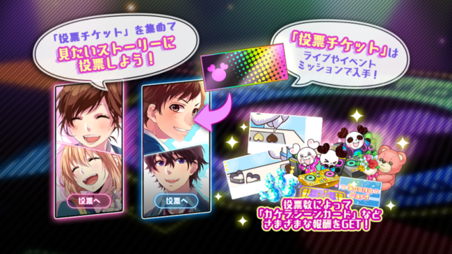 また、投票期間中はライブやイベントミッションのクリア報酬から獲得できる「投票チケット」を集めて投票を行うと、投票数に応じた報酬アイテムが獲得できますので、ぜひご参加ください!