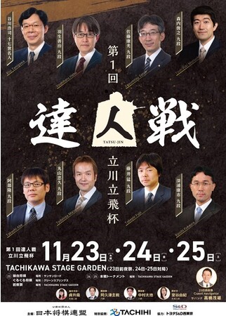 「達人戦立川立飛杯」は、予選トーナメントを勝ち抜いた50歳以上の現役4棋士が、前述の4レジェンドと、勝者の称号「達人」を目指し、11月24日(金)、25日(土)の2日間「立川ステージガーデン」(東京都立川市)にて本選の公開対局に臨むもので、