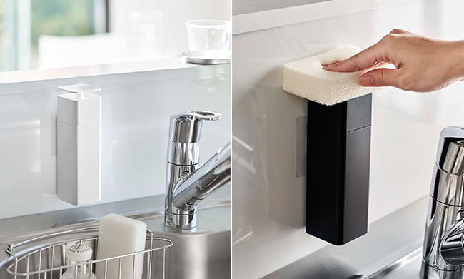 フィルムフックで光沢のある壁面に浮かせて収納できるディスペンサー。