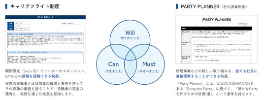 また、NAVICUSでは新規事業や責任ある役職へのチャレンジにおいても、本人の「やりたい」という気持ちを大切にし、個々のキャリア形成を支援する社内制度づくりをおこなっています。