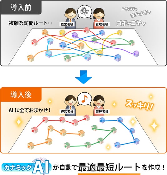 この度、当社が提供する「カナミックかんたんAI訪問ルート」をご利用頂くことで、事業所の稼働率を最大化し、訪問ルート作成業務の時間削減が可能となります。これにより、事業所の売上の最大化、スタッフの最適配置による業務の効率化を実現します。