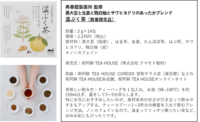熊本にルーツを持ち、理念を同じくする両社で開発した「温ぷく茶」は、漢方の製薬会社「再春館製薬所」の薬膳の知恵を活かした地元素材を選出・活用。その他素材もすべて国産・農薬不使用素材の積極的活用という安心感も。さらには同社が化粧品事業で培ってきたサイエンス技術を応用し、秋冬の“温活”を目的とした調合・設計になっています。