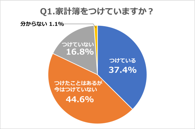 20代から40代のご家庭を対象に、「家計簿をつけていますか」と質問しました。その結果、「家計簿をつけている」が37.4%、「つけたことはあるが、今はつけていない」が44.6%、「つけていない」が16.8%でした。(図1)