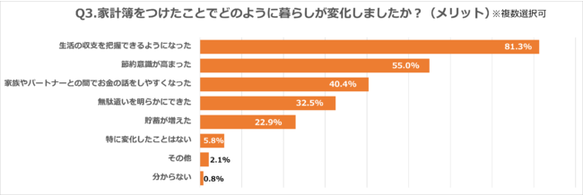 Q.1で、家計簿をつけていると回答した人に「家計簿をつけることでどのように暮らしが変化したか(メリット)」を質問したところ、最も多かったのは「生活の収支が把握できるようになった(81.3%)」、次いで回答が多かったのは「節約意識が高まった(55.0%)」でした。(図3)