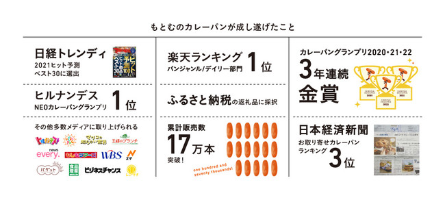 2020年に公式オンラインショップを開設し、多い日には1日に約6,000本を販売。各メディアにて入手が難しい「幻のカレーパン」としてご掲載をいただき、日本一のカレーパンを決める「カレーパングランプリ2022」では沖縄県勢初となる、3年連続金賞を獲得!楽天ランキング「パンジャンル/デイリー部門」でも1位を獲得し、さらに2021年12月に「日本経済新聞」の土曜版「NIKKEIプラス 1」のお取り寄せカレーパンランキングで「もとむのカレーパン」が3位を獲得しました。2022年4月から沖縄県内でラジオCM放送中!