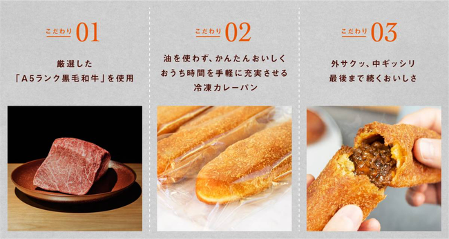 もとむのカレーパンをより多くお楽しみ頂くための秘訣は、お店でも自宅でも、いつでも熱々でサクッとした「一口目の感動食感」を体感できることです。その感動食感を提供する重要なファクターは“冷凍カレーパン”であることです。職人が手作りしたカレーパンをカラッと揚げ、その後すぐに冷凍することで、パンの長期保存が可能になり、フードロス削減を実現しました。また、冷凍パンにすることで、配送エリアの拡充と受取手側の自由度が高まり、全国の方にお召し上がりいただく機会を増やすことに成功。食べる直前にオーブン、もしくはトースターで焼き上げることにより、パンに残っている余分な油を落としきり、よりヘルシーで、サクッと口当たりの軽い“感動食感”を生み出しています。冷凍だから、いつでも熱々を提供できること、そしてカレーパンでも珍しい、揚げ焼
