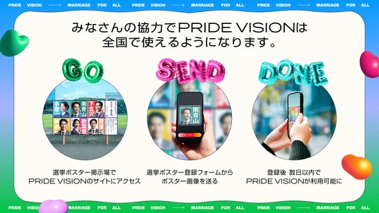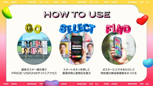 同性婚法制化の早期実現を目指すマリフォーは選挙ポスターに着目。有権者が同性婚に賛成している候補者を円滑に認知し、日本国内における政治参加や候補者選びを促進することができる仕組みとして「PRIDE VISION」を開発しました。