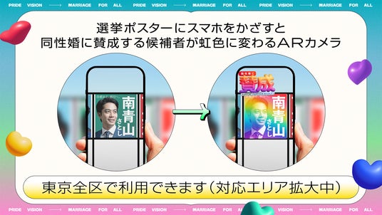 結婚の平等(同性婚の法制化)実現を目指す、公益社団法人Marriage For All Japan - 結婚の自由をすべての人に(以下、マリフォー)は、街頭に掲示される選挙ポスターにスマートフォンをかざすだけで、同性婚の法制化に賛成している候補者を一目で見分けることができる世界初のARカメラ「PRIDE VISION」( https://pride-vision.com/ )の衆院選2024対応バージョンを本日10月17日(木)に公開しました。本日10時より東京都の全ての小選挙区にて利用可能となり、スマートフォンを選挙ポスターにかざすだけで、どなたでも同性婚の法制化に賛成している候補者を知ることができます。また、10月27日(日)までの選挙期間中に日本中の選挙区で「PRIDE VISION」が利用可能になることを目指し、各選挙区に掲示される選挙ポスターの画像情報を収集協力してくださるサポーターを本日より募集します。