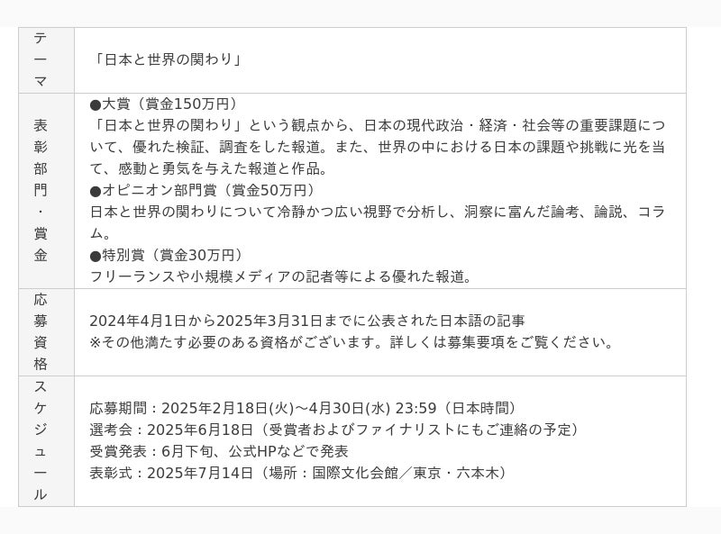 公益財団法人国際文化会館(東京都港区、理事長 近藤 正晃ジェームス)は、「日本と世界の関わり」というテーマの優れた報道を表彰する、第2回「国際文化会館ジャーナリズム大賞」の作品募集を開始いたします。