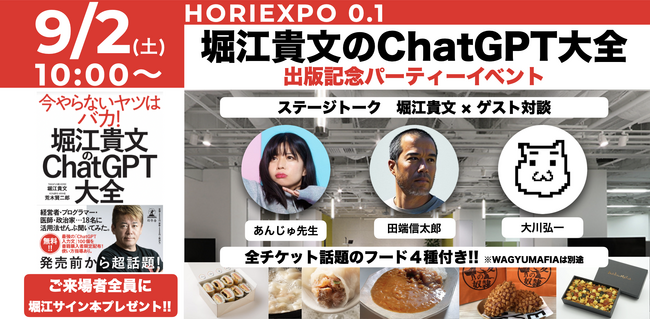 2023年9月2日(土曜)10:00-12:00に開催される「堀江貴文のChatGPT大全」出版記念パーティーイベントを開催することになりましたので、お知らせいたします。