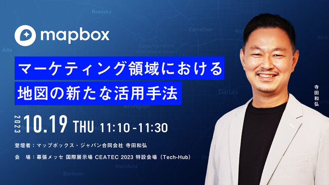 CEATEC 2023では、「Mapbox Geofence Solution」の展示やデジタル地図を活用したさまざまなコンテンツを紹介します。 また、19日(木)11:10より行う講演では、Mapboxの概要や最新の取り組みや位置情報を活用したマーケティングの可能性を事例とともに紹介します。