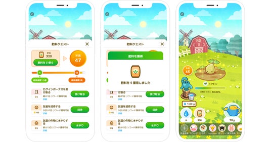 今回新たに、「肥料」という機能を追加します。この肥料を使用することで、デジタル上の作物を早く育てることが可能になります。肥料は、友達を「カウシェファーム」に招待することで、招待する側と招待された側の双方が獲得することができ、友達とのコミュニケーションを楽しめる仕掛けになっています。