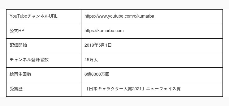クマーバチャンネルは、お子さまがキャラクターと一緒に楽しく成長できるエンタメ知育チャンネルです。「未就学児の想像力と表現力を豊かにし、可能性を広げる」ことをテーマにコンテンツを制作しています。YouTubeで良質なコンテンツを配信することで、いつでもどこでも楽しみながら心身ともに成長できることを目指しています。新しい未就学児向けコンテンツとして評価され、「日本キャラクター大賞2021」ニューフェイス賞を受賞しました。