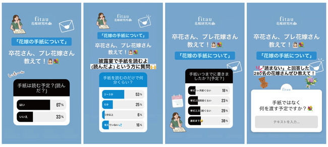 株式会社エーキューブ(本社:東京都多摩市、代表取締役社長:野坂透)が運営するブライダルアイテムショップfitau(フィタウ)の、自社Instagramアカウント(@fitau_official)のフォロワーに対して、インスタグラムストーリーズのアンケート機能を用いて、結婚式の「花嫁の手紙」事情を調査いたしました。