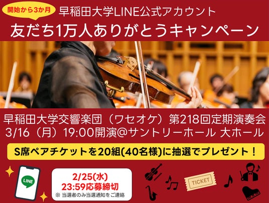 早稲田大学の創立記念日にあたる10月21日に初回のニュース配信を開始し、多くの皆さまに支えられ、開始から3か月で友だち1万人を迎えることができました。この節目を記念し、これまで寄せられた反響への感謝を込めて、より多くの方にLINE公式アカウントを知っていただく機会として、「早稲田大学交響楽団(通称:ワセオケ)定期演奏会」のS席ペアチケットを、抽選で20組40名様にプレゼントするキャンペーンを実施します。応募方法含むキャンペーンの詳細ページはこちらからご覧いただけます。