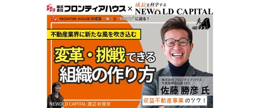 総合不動産事業を行う株式会社フロンティアハウス(本社:神奈川県横浜市)の代表取締役社長CEO佐藤勝彦は、「成長を科学する」ことをテーマに株式会社NEWOLD CAPITAL(東京本社:東京都渋谷区、代表取締役CEO:栗原弘行)が運営するYouTube番組「NEWOLD CHANNEL」に出演し、「成長ツウ!」を題材に不動産業界に新たな風を吹き込む変革・挑戦できる組織の作り方や、会社の将来を描くために新規取組みとして社内ベンチャー制度の開始について話しました。