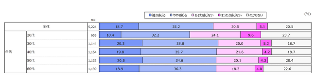 【男女の賃金格差】男女間での賃金格差を感じている女性は30代~60代では55%でしたが、20代では40%程度と他世代と比べて低い結果となりました<図5>。これは若い世代では昇給・昇格の機会や結婚・出産といったライフイベントがまだ少ないことを反映しているかもしれないです。