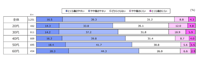 <図1> 現在の職場が自分自身にとって働きやすいか(就労中の女性3,251名の回答)