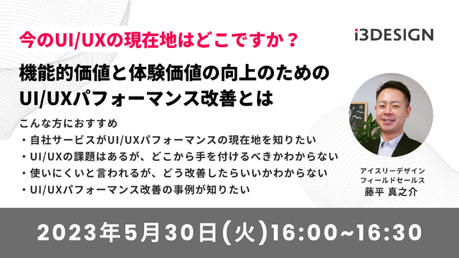 株式会社アイスリーデザイン(本社:東京都渋谷区、代表取締役:芝 陽一郎、以下:アイスリーデザイン)は、「今のUI/UXの現在地はどこですか?機能的価値と体験価値の向上のためのUI/UXパフォーマンス改善とは」をテーマに2023年5月30日(火)16時よりオンラインセミナーを開催いたします。