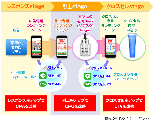 そして、売れるネット広告社が提供するクラウドサービス『売れるD2Cつくーる』は、膨大な数の【A/Bテスト結果】 =“最強の売れるノウハウ(R)”を搭載したクラウドサービスです。“最強の売れるノウハウ(R)”を最初から機能化した、「ネット広告/ランディングページ特化型クラウドサービス」で、「ランディングページ制作」「申込フォーム」「フォローメール配信/フォローLINE(R)配信/フォローSMS(R)配信」など、D2C(ネット通販)のネット広告の費用対効果を改善するさまざまな機能をワンストップで提供しています。