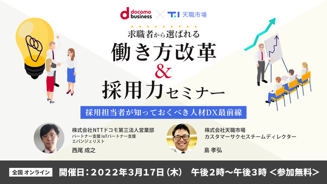 企業の採用活動を支援する株式会社天職市場(本社:東京都新宿区西新宿、代表取締役:森部 浩史)は、2022年3月17日(木)に社員採用担当者向けのセミナー『求職者から選ばれる働き方改革と採用力セミナー』を開催いたします。