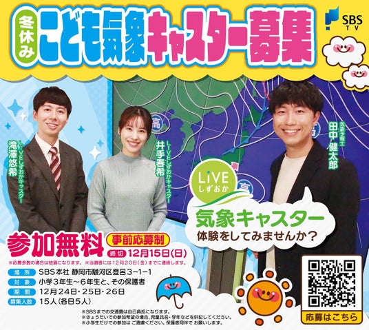 SBSテレビ『LIVEしずおか』は、こどもたちにテレビに親しんでもらおうと、冬休みの体験を企画しました。もうすぐ始まる冬休み、SBSテレビのスタジオを見学したり、アナウンサーから話し方の基本を教えてもらったり、気象キャスターを体験してみませんか?