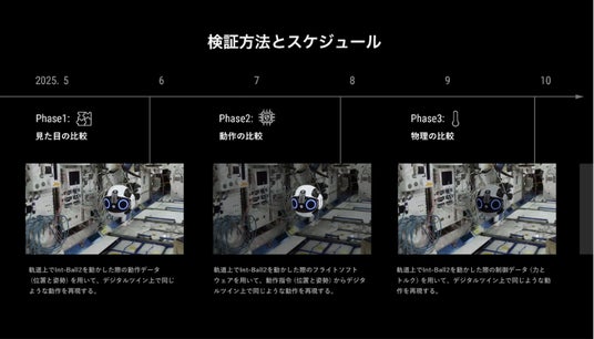 今回の実証実験は、ISS・「きぼう」日本実験棟を利用する有償利用制度(*1)を活用し、ISS内で稼働する船内ロボット「Int-Ball2」実機の動作データを取得し、当社が開発するデジタルツイン上で同じ動作を再現するというものです。これにより、実際のISSではカメラや視野の制限により死角になっていた箇所も、デジタルツイン上で再現することにより、Int-Ball2の動作を様々な角度から自由に観察・確認できるようになります。
